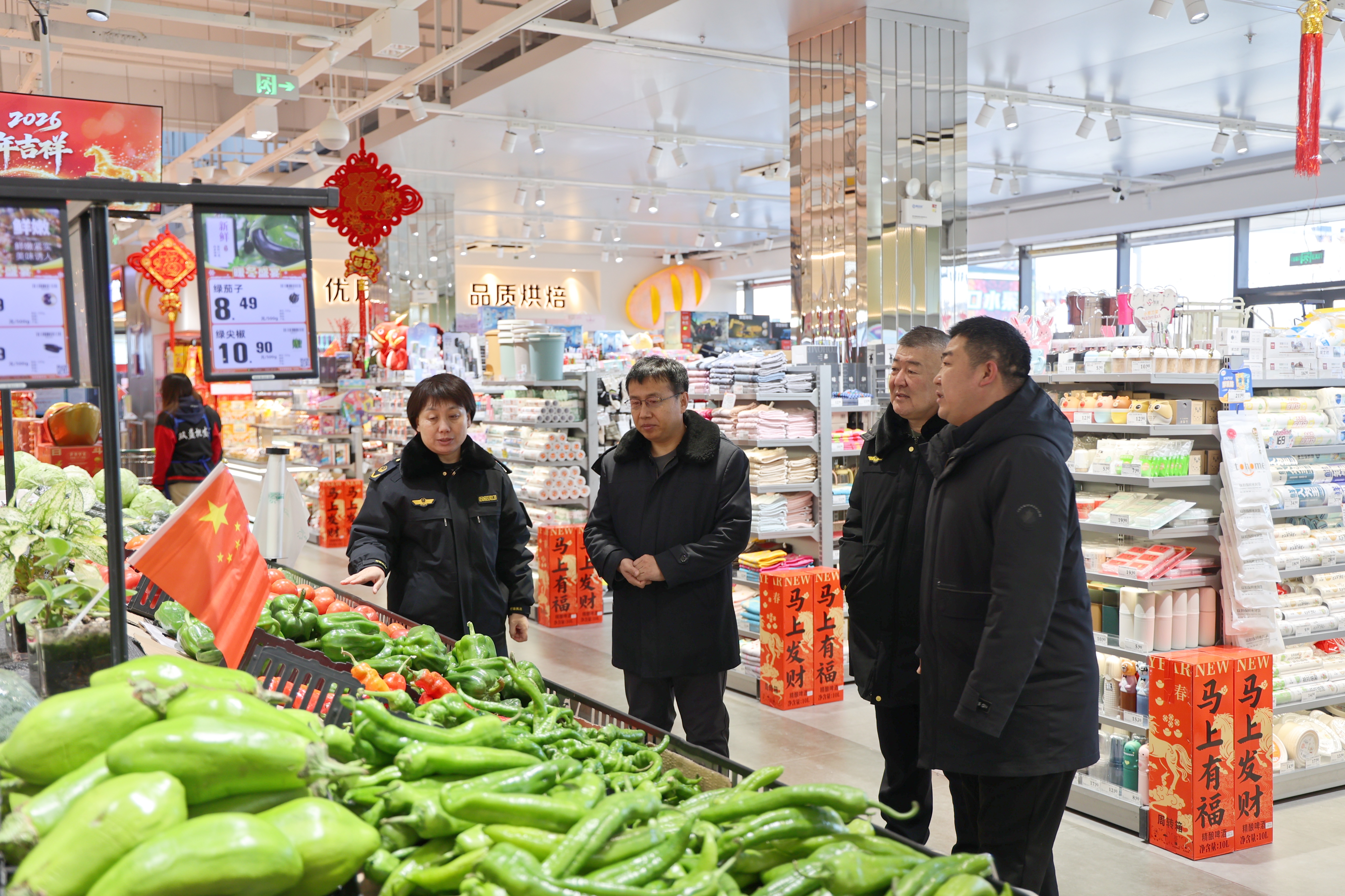 此次行动紧扣春节消费特点与食品安全风险点,将辖区内客流量大、经营品类多、辐射范围广的三个重点商超作为核心监督对象。紧盯节日热销食品、冷链食品、预制菜、肉畜制品、乳制品、生鲜农产品、节庆酒水等重点品类开展全流程监督,主要核查食品经营主体资质、从业人员健康管理、进货查验记录、商品明码标价落实情况等关键内容。针对现场排查出的食品贮存条件、标签标识等环节存在的安全问题,及时开展了法治提醒。同时督促商超经营者严格落实食品安全主体责任,健全内控管理与质量管控机制,坚守合规经营底线。