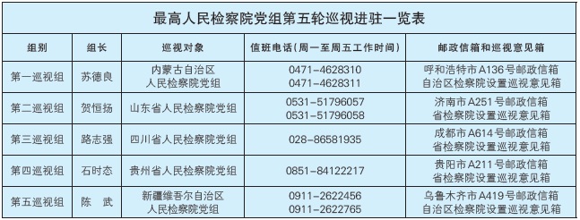 本报北京10月22日电(记者刘亭亭)根据最高人民检察院党组统一部署,最高检党组第五轮巡视分别对内蒙古、山东、四川、贵州、新疆5个省级检察院党组开展为期两个月的常规巡视。10月14日,最高检党组召开第五轮巡视动员部署会,其后开展了为期两天半的巡前培训。近日,各巡视组完成巡视进驻。